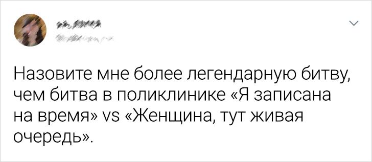 - В поликлинике подходит моя очередь на 12:30. И тут вбегает запыхавшаяся бабка с вопросом: «Кто следующий?» Поднимаю руку, и она всем озвучивает: «За вами буду, у меня талон на 8:45». Очередь гудит: с какой стати, если уже почти час дня? На что она невозмутимо отвечает: «Я ведь в 8:45 не пошла, значит, кто-то вместо меня зашел, и получается, что я его пропустила. Теперь тоже имею право зайти вместо кого-то». В этот момент уже подошла моя очередь, и после приема я был очень удивлен, когда без какой-либо привычной для такой ситуации ругани в кабинет вошла именно она. © Adei69 / Pikabu