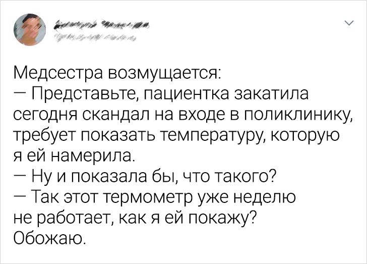 - Ставили сегодня детям манту в поликлинике. Врач говорит: «3 дня не мочить, в понедельник приходите с этими же детьми проверять реакцию на прививку». Мы в недоумении: «А с какими же еще? Естественно, с этими придем». Врач: «Ну не знаю. К нам недавно пришел мужчина с малышом. Поставили ребенку манту. Через несколько дней он пришел на проверку без ребенка. Говорит: „А вы не сказали, что именно с ребенком надо“. — „Эм… ну могу у вас реакцию проверить“. И он еще после этого жалобу главврачу оставил, что ему нахамили. Писала объяснительную». © Alexograf / Pikabu