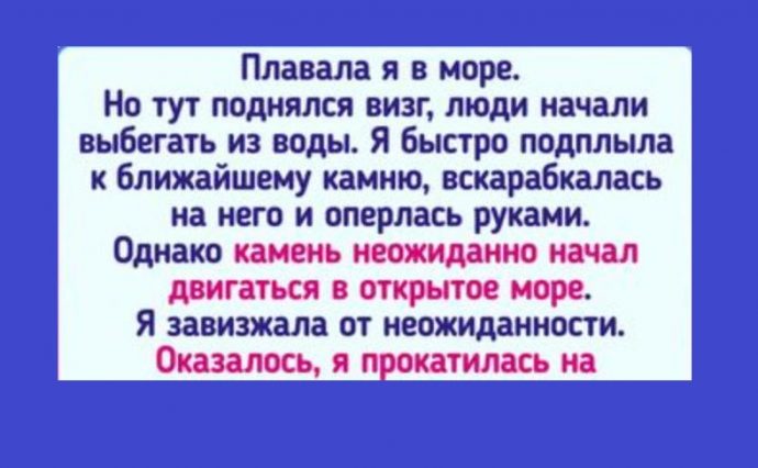 - Плавала в море. Но тут поднялся визг, люди начали выбегать из воды. Я ничего в ней не увидела и быстро подплыла к ближайшему камню, вскарабкалась на него и оперлась руками. Однако камень совершенно неожиданно начал двигаться в открытое море. Я завизжала не то чтобы страха, что я затеряюсь там, а от неожиданности. Оказалось, я прокатилась на ламантине. © Подслушано — Здесь говорят о тебе / VK