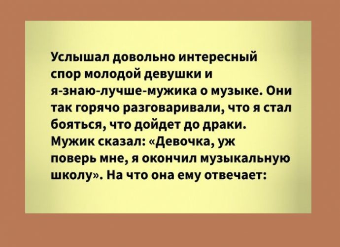 Работаю в одном пабе музыкантом и недавно услышал довольно интересный спор молодой девушки с мужчиной. Их разговор, переходящий в спор, шел о каком-то классическом произведении, уже не помню каком. Они так горячо друг с другом разговаривали, что я стал бояться, не дойдет ли до драки, и двинулся к девушке на подмогу. Но не успел я дойти, как мужик сказал: «Девочка, уж поверь мне, я окончил музыкальную школу». На что она ему отвечает: «Ну да, куда уж мне, дирижеру симфонического оркестра, тягаться с выпускником музыкалки». Финита ля комедия, друзья. Ржали все, кто это слышал.