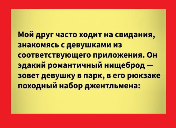Мой друг часто ходит на свидания, знакомясь с девушками из соответствующего приложения. Он эдакий романтичный нищеброд — зовет девушку в парк, в его рюкзаке походный набор джентльмена: турка, горелка, чашечки для кофе, вкусняшки и пара пледиков. Девушки млеют, когда он им заваривает кофе на природе, и жмутся к нему греться под плед.
