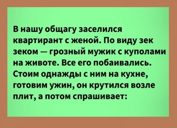В нашу общагу заселился квартирант с женой. По виду зек зеком — грозный мужик с куполами на животе. Все его побаивались.
