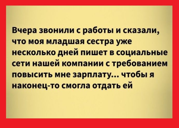 Сегодня позвонили с работы. Я испугалась, мол, что-то случилось, у меня проблемы и все в таком роде. Но мне лишь хотели сказать, что моя младшая сестра уже несколько дней пишет в социальные сети нашей компании с требованием повысить мне зарплату… чтобы я наконец-то смогла отдать ей деньги, проигранные в споре.