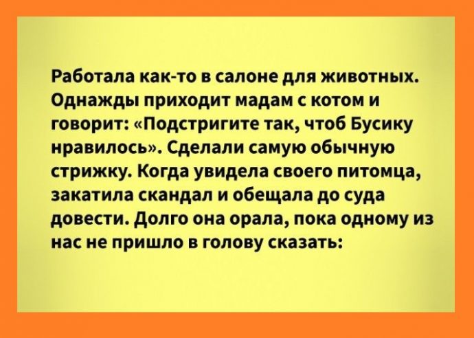 Работала как-то в салоне для животных. Однажды приходит мадам и говорит: «Подстригите мне кота». На вопросы — как, отвечала только: «Главное, чтоб Бусику нравилось». Подстригли. Когда увидела своего питомца, закатила скандал и обещала до суда довести за то, что издевались над её животным, хотя стрижка самая обычная. Долго она орала, пока одному из нас не пришло в голову сказать: «А Бусику, вообще-то, нравится». Мадам стихла, улыбнулась, поблагодарила и ушла.