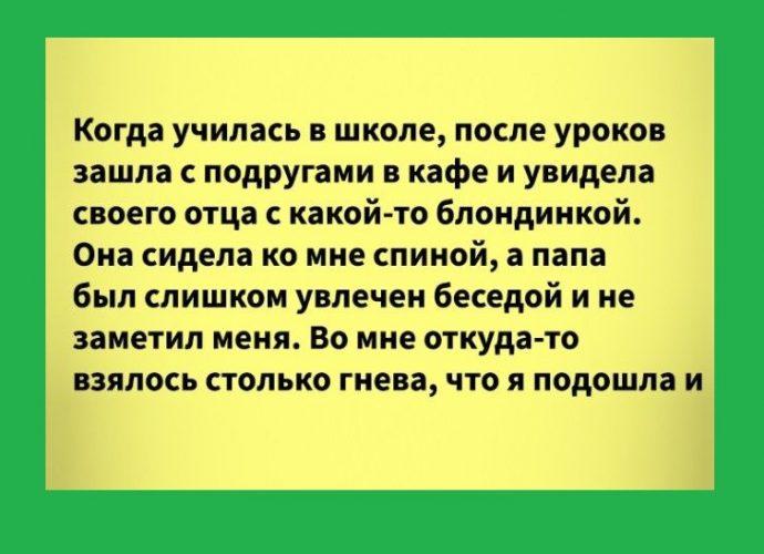 Когда училась в школе, после уроков зашла с подругами в кафе и увидела своего отца с какой-то блондинкой. Она сидела ко мне спиной, а папа был слишком увлечен беседой и не заметил меня. Во мне откуда-то взялось столько гнева, что я подошла и вылила этой крале стакан холодной воды на голову. Она с криками подрывается с места, мы с нею встречаемся взглядами, и я вижу, что это моя мама. Она просто перекрасила волосы.