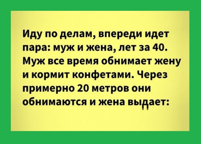 Иду по делам, впереди идет пара: муж и жена, лет за 40. Муж все время обнимает жену и кормит конфетами. Через примерно 20 метров они обнимаются и жена выдает: «Ты такой милый, когда жрать хочешь».