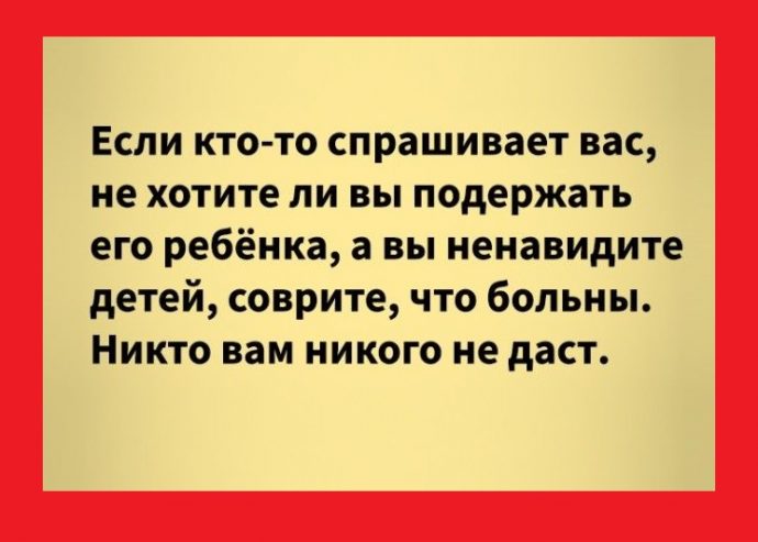 Если кто-то спрашивает вас, не хотите ли вы подержать его ребёнка, а вы ненавидите детей, соврите, что больны. Никто вам никого не даст.