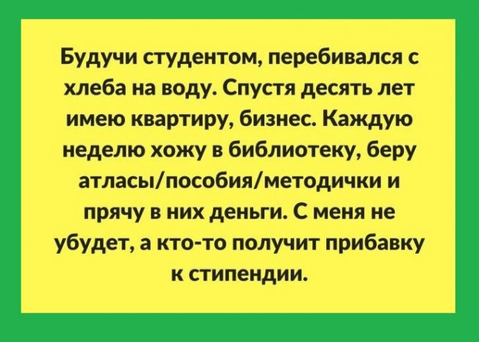 Будучи студентом, перебивался с хлеба на воду. Спустя десять лет имею квартиру, машину, бизнес. Каждую неделю хожу в библиотеку, беру атласы/пособия/методички и прячу в них деньги. С меня не убудет, а кто-то получит прибавку к стипендии.