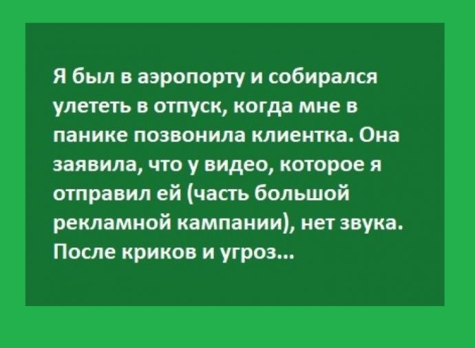 Я был в аэропорту и собирался улететь в отпуск, когда мне в панике позвонила клиентка. Она заявила, что у видео, которое я отправил ей (часть большой рекламной кампании), нет звука. После криков и угроз с её стороны, я согласился приехать к ней в офис и всё исправить. В офисе я включил видео и дважды проверил, включен ли звук на компьютере. Отсоединил её наушники. И выставил счёт за пропущенный рейс.