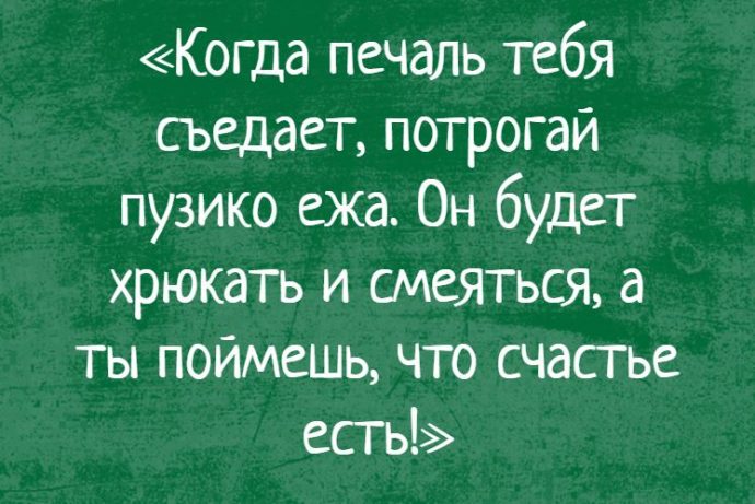 «Когда печаль тебя съедает, потрогай пузико ежа. Он будет хрюкать и смеяться, а ты поймешь, что счастье есть!» — этой фразой всегда поднимаю себе настроение, просто произнося ее про себя. Хочу поделиться — вдруг кому-то это поможет улыбнуться, когда кажется, что все совсем плохо.