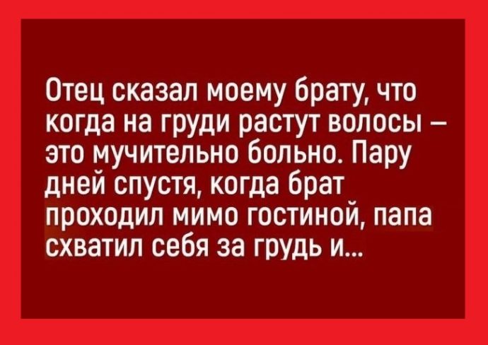 Мой отец сказал моему брату, что когда на груди растут волосы — это мучительно больно. Пару дней спустя, когда брат проходил мимо гостиной, папа схватил себя за грудь и закричал: «ААААААААААААА! Ещё один волос лезет!». Чертовски напугал его. Брат в это верил, пока у него самого волосы на груди не выросли.
