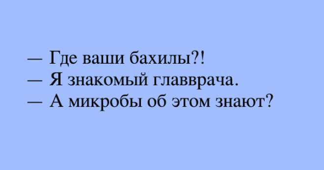 Курьезы Отличная подборка классных шуток Представляем Вам смешную и веселую подборку для отличного настроения. Обалдеть! Источник АнекдотыИнтересноОбществоРАЗВЛЕЧЕНИЯ Уморительные истории, рассказанные врачами и их пациентами Жизненные истории, в которых узнаете себя