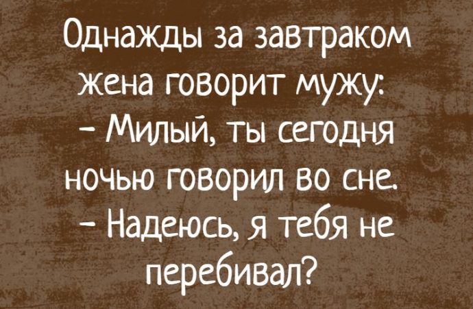 Супруги смотрят фильм ужасов. Идут самые ужасные кадры, появляются жуткие чудовища… Жена прижимается к мужу и шепчет: