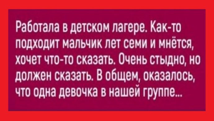Работала в детском лагере. Как-то подходит один из мальчиков (7 лет) и так мнётся, хочет что-то рассказать. Очень стыдно такое говорить, но должен сказать. В общем, оказалось, что одна девочка в нашей группе ругается и говорит страшное слово «Блин». Но это ещё не все. Он сам когда-то сказал не менее страшное «Елки-палки» и очень об этом сожалеет! Назвал эти ужасные ругательства — матюками первого уровня и доверил мне судьбу малолетних нарушителей моральных устоев.