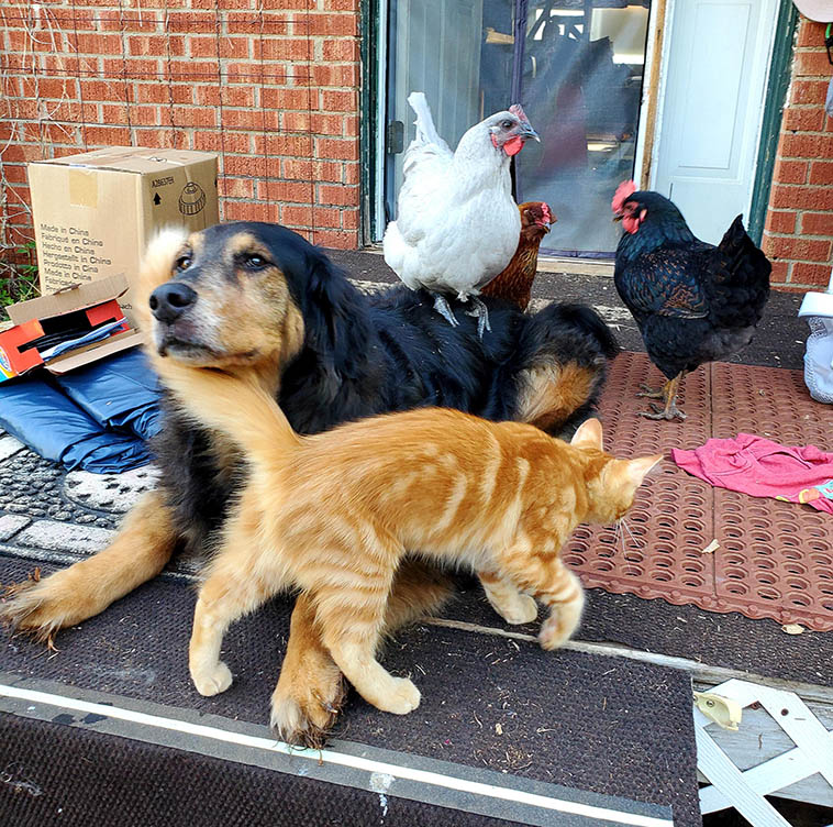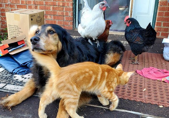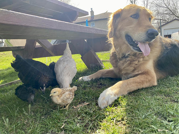 3. А здесь целое семейство кур водит дружбу с домашним лабрадором. Под его защитой они в полной безопасности.