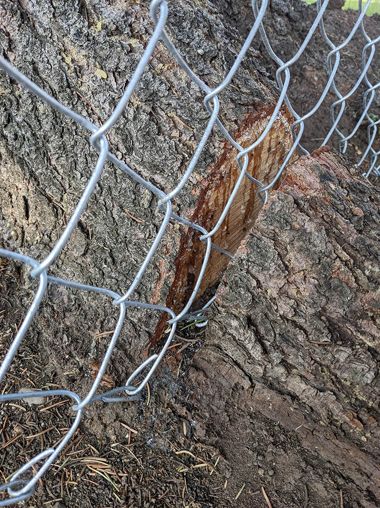 Заборчику из сетки мешало бревно. Теперь бревно находится по обе стороны от заборчика.