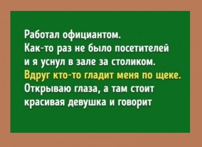 Работал официантом в ресторане. Как-то раз весь день не было ни одного посетителя до 8 вечера. Уснул в зале за столиком от скуки. Проснулся от того, что кто-то гладит меня по щеке! Открываю глаза, а напротив стоит красивая девушка и говорит мне: «Хороший мой! Я жрать хочу!»