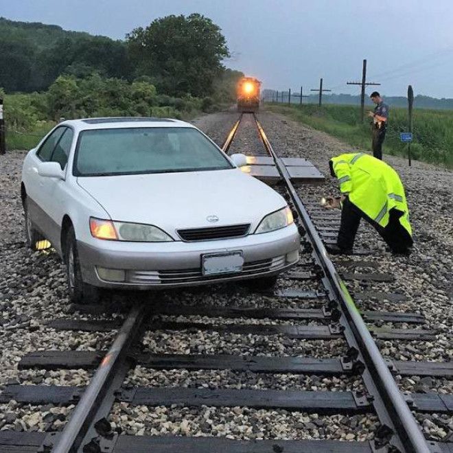 Машинист вовремя заметил застрявший на железных путях автомобиль и успел затормозить