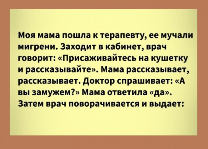 Моя мама как-то пошла к терапевту, так как мучали мигрени, ничего делать не могла. Заходит она в кабинет, врач стоит и смотрит в окно, говорит: «Присаживайтесь на кушетку и рассказывайте». Мама рассказывает, рассказывает. Говорит, что голова болит жутко, ничего не помогает. Он же стоит возле окна и молча смотрит в него, мама закончила свой монолог, доктор молчит еще минуту, потом спрашивает: «А вы замужем?» Мама ему ответила «да». Затем врач поворачивается и выдает: «Так а что вы хотели? Чтобы и замужем быть, и голова не болела?» И зовет следующего пациента.