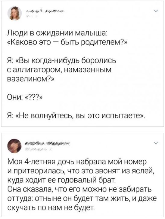 Собственно, никто и не говорил, что родительство будет легким. Однако, никогда не стоит сгущать краски и забывать о юморе, который отлично защищает нервные клетки.