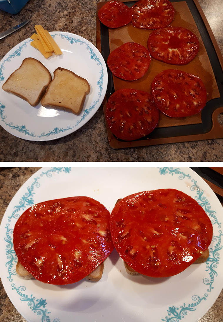 1. “У меня на огороде вырос такой большой помидор, что его ломтики едва помещаются на тосты”