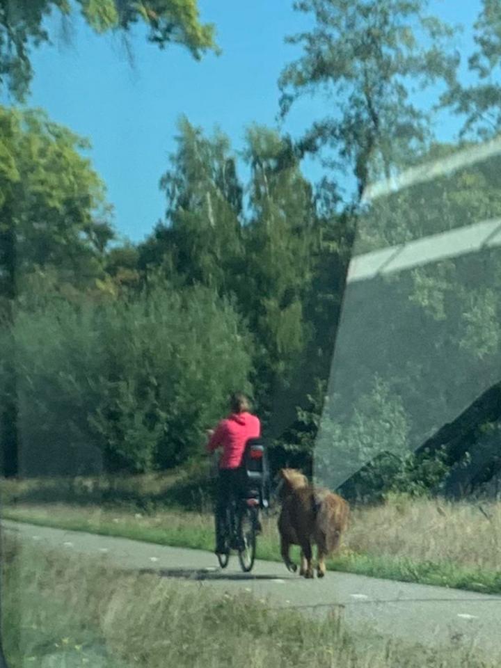 12. Женщина катается на велосипеде и одновременно выгуливает своего пони
