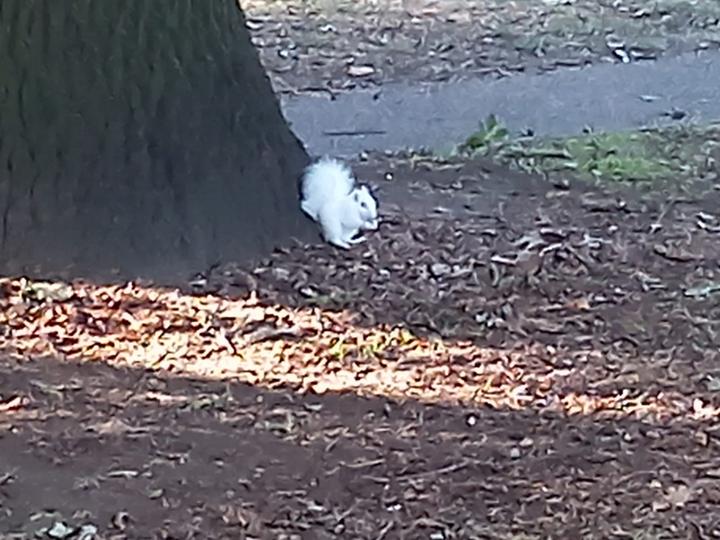 9. Снежно-белую белку-альбиноса трудно не заметить в осеннем парке