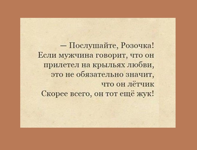 — Послушайте, Розочка! Если мужчина говорит, что он прилетел на крыльях любви, это не обязательно значит, что он лётчик. Скорее всего, он тот ещё жук!