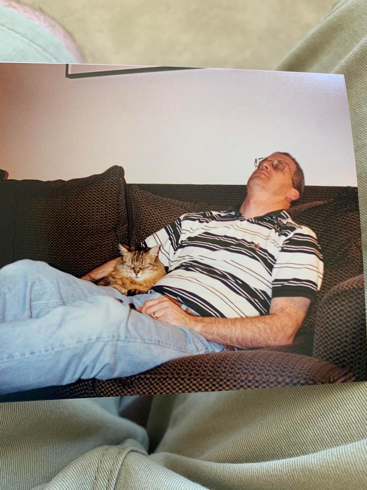 2. “Пересматривала старые фотографии, и нашла этот снимок. На нем мой папа, которого нужно было очень долго уговаривать, чтобы завести кота.”
