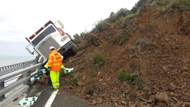 Грузовик чудом не вылетел с трассы во время оползня. Слева Тихий океан!