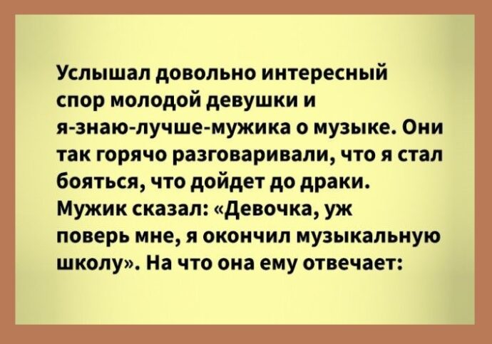 Работаю в одном пабе музыкантом и недавно услышал довольно интересный спор молодой девушки и я-знаю-лучше-мужика. Их разговор, переходящий в спор, шел о каком-то классическом произведении, уже не помню каком. Они так горячо друг с другом разговаривали, что я стал бояться, не дойдет ли до драки, и двинулся к девушке на подмогу. Но не успел я дойти, как мужик сказал: «Девочка, уж поверь мне, я окончил музыкальную школу». На что она ему отвечает: «Ну да, куда уж мне, дирижеру симфонического оркестра, тягаться с выпускником музыкалки». Финита ля комедия, друзья. Ржали все, кто это слышал.