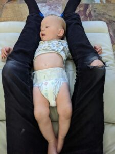 Положите ноги на руки вашего ребёнка, чтобы он не хватался за грязный подгузник во время его смены