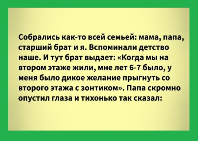 Собрались как-то всей семьей: мама, папа, старший брат и я. Вспоминали детство наше. И тут брат выдает: «Когда мы на втором этаже жили, мне лет 6-7 было, у меня было дикое желание прыгнуть со второго этажа с зонтиком». Папа скромно опустил глаза и тихонько так сказал: «Не получилось бы… Зонтик выворачивается…»