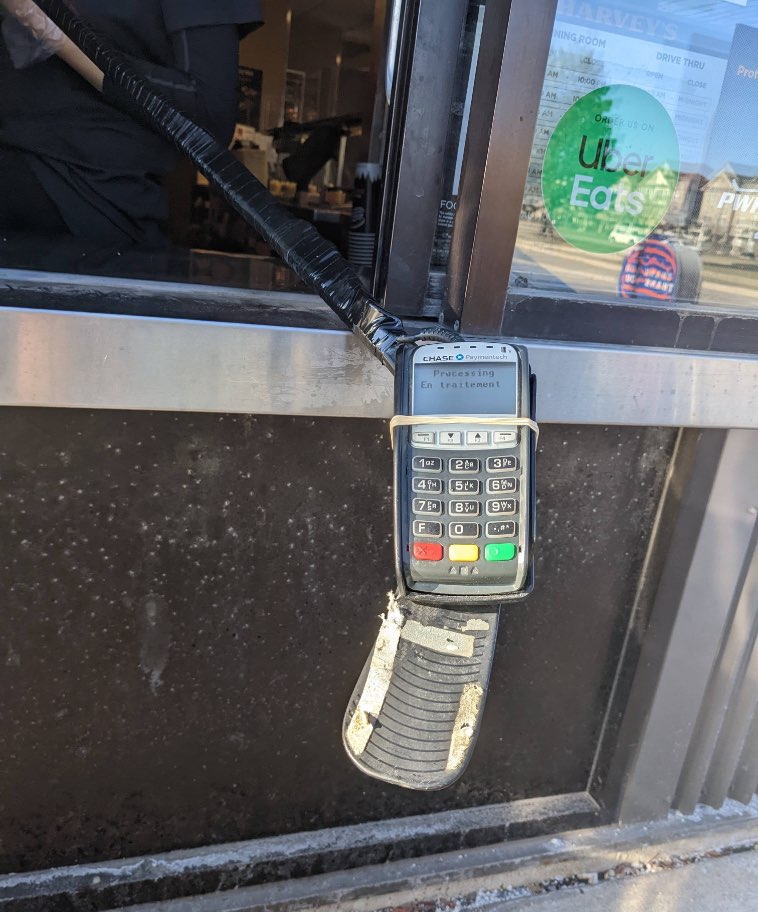 16. “Увидела в Канаде терминал для оплаты, который прикрепили к хоккейной клюшке. Может фишка такая, а может вынужденная мера, чтобы на холод из окошка лишний раз не высовываться.”