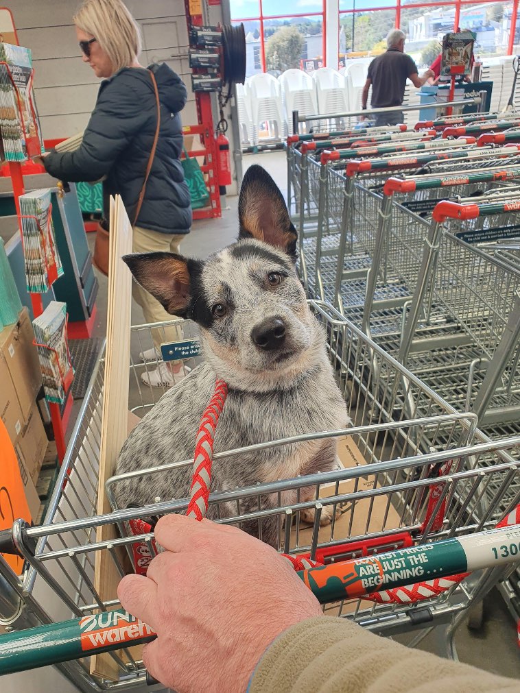 “Собакам можно посещать Bunnings, если они при этом будут сидеть в тележке. Барни впервые заглянул со мной в этот магазин.”