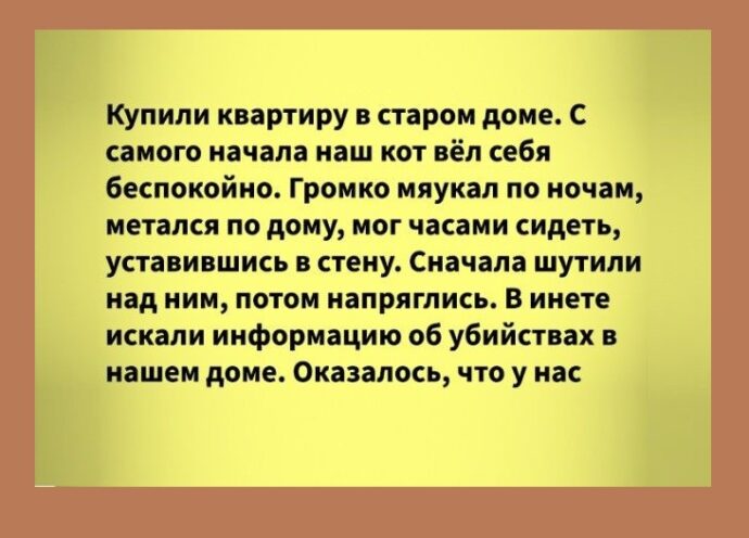 Купили квартиру в старом доме. С самого начала наш кот вёл себя беспокойно. Громко мяукал по ночам, метался по дому, мог часами сидеть, уставившись в стену. Сначала шутили над ним, потом напряглись. В инете искали информацию об убийствах в нашем доме. Оказалось, что у нас просто мыши…