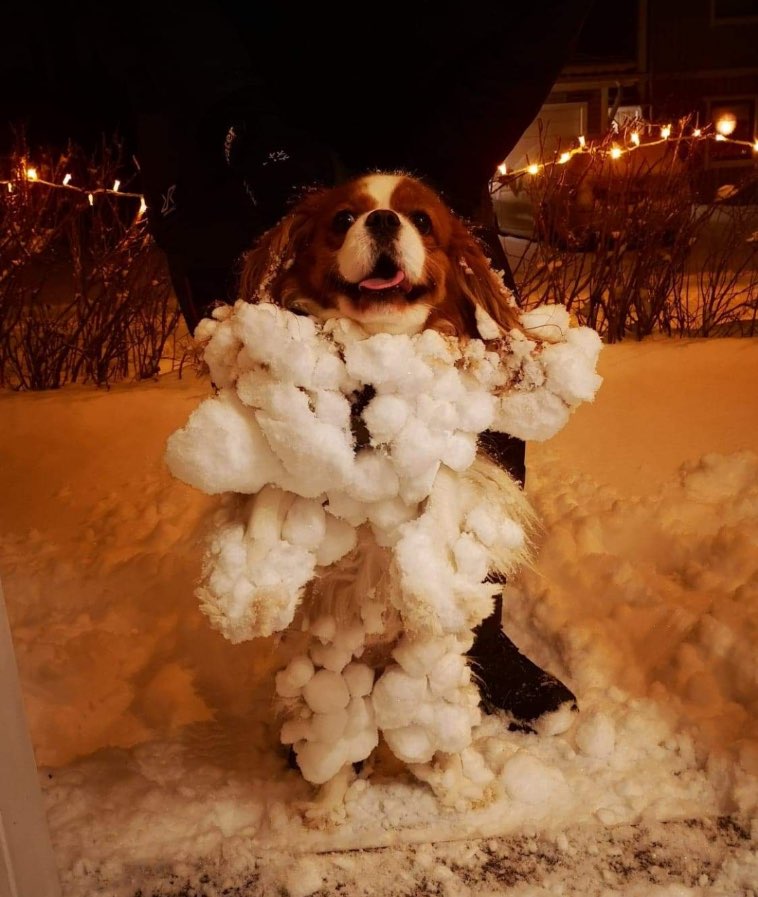 8. “Мы поиграли в снегу минут 20 и теперь моя собачка выглядит, как снеговик”
