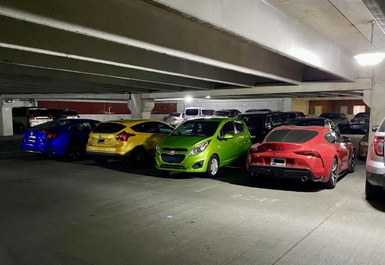 1. “Чисто случайно владельцы этих ярких машинок припарковались друг возле друга. И этот ряд сильно выделялся на фоне всех остальных серых автомобилей на парковке.”