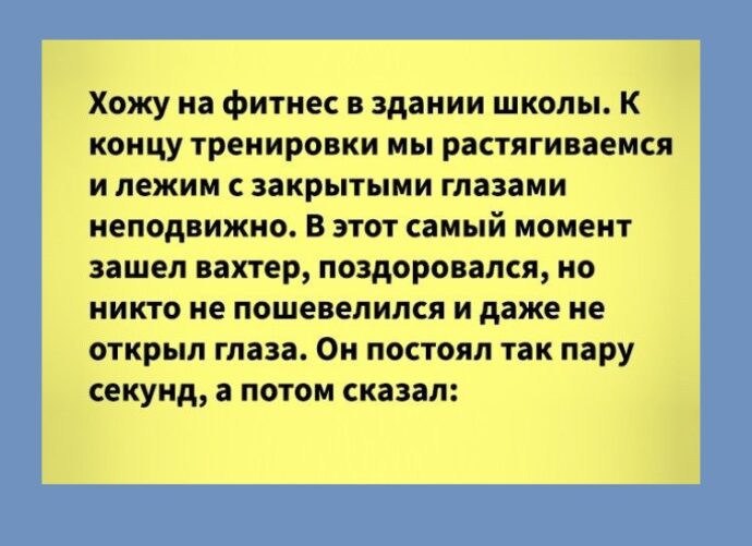 Хожу на фитнес в здании самой обыкновенной школы. К концу тренировки мы растягиваемся и лежим с закрытыми глазами неподвижно на гимнастическом коврике ровно минуту (дабы достичь уже полной нирваны). Однажды в этот самый момент зашел вахтер (я узнала его по голосу), поздоровался, но никто почему-то не пошевелился и даже не открыл глаза. Он постоял так пару секунд, а потом сказал: «Умерли, что ли, все». И ушел.