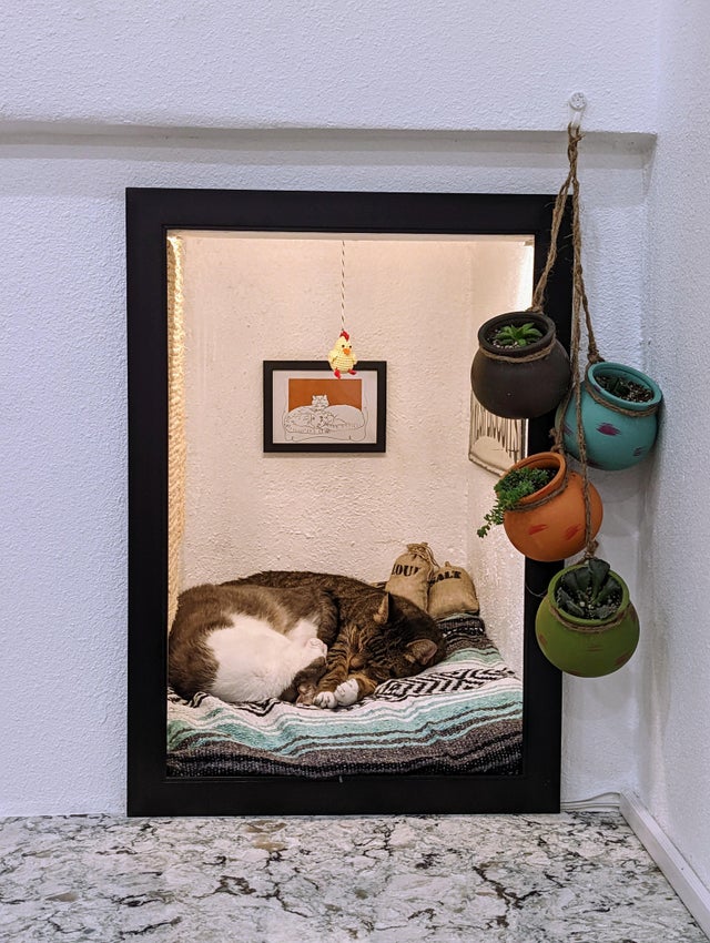 Но это не картинка, а райский уголок для кота. Ведь они тоже заслужили иметь своё личное пространство. Но стоит отметить, что не у каждого хвостатого найдётся такая комнатка с евро-ремонтом, как у господина со снимка выше.