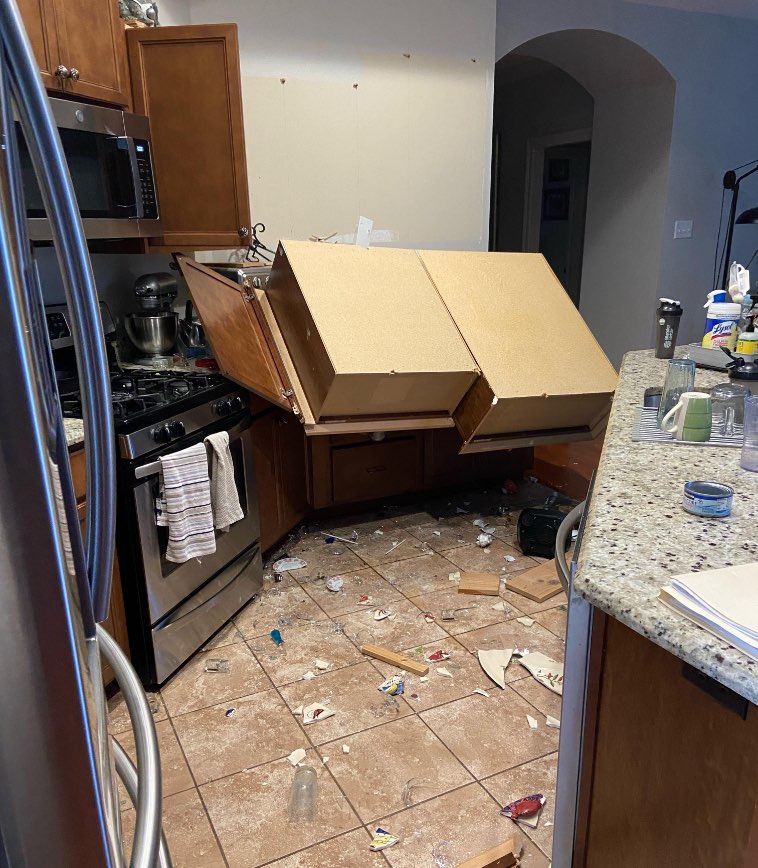 “Мы в этом году уехали на праздники на пару дней. По приезду ждал вот такой сюрприз. Шкаф на кухне просто обвалился.”