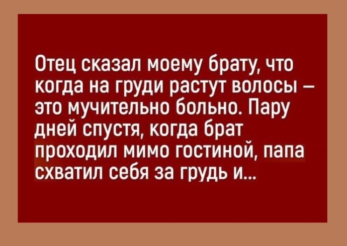 Мой отец сказал моему брату, что когда на груди растут волосы — это мучительно больно. Пару дней спустя, когда брат проходил мимо гостиной, папа схватил себя за грудь и закричал: «ААААААААААААА! Ещё один волос лезет!». Чертовски напугал его. Брат в это верил, пока у него самого волосы на груди не выросли.