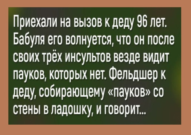 Приехали на вызов к деду 96 лет. Бабуля его волнуется, что он после своих трех инсультов везде видит бегающих пауков, которых нет. Мой фельдшер к деду, собирающему «пауков» со стены в ладошку: