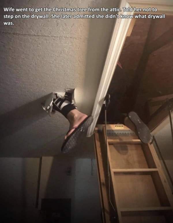 Жена отправилась за ёлкой на чердак. Я предупредил её, чтобы она не становилась на гипсокартон. Позже она сказала, что понятия не имела, как он выглядит.