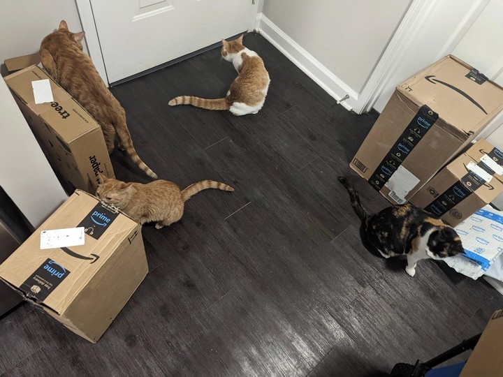 14. “Мои коты ждут, пока я распакую посылки. Ведь им достанутся коробки!”