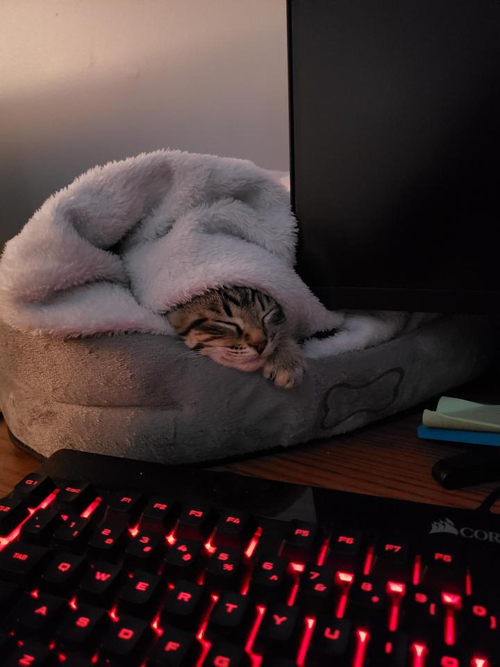 1. “Котенок не любит быть один, поэтому пришлось обустроить ему спальное место прямо на рабочем столе возле компьютера”