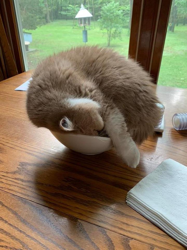 14. “Новый трюк от моего кота — заснуть прямо в миске с водой”
