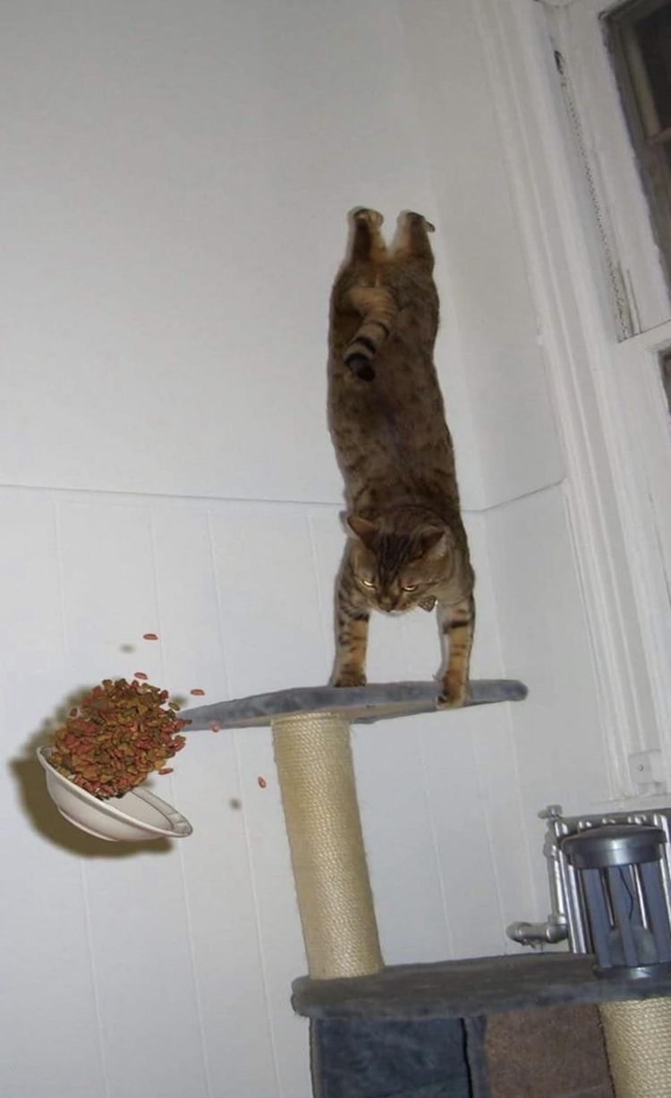 Стойка на руках лапах и рассыпавшийся корм