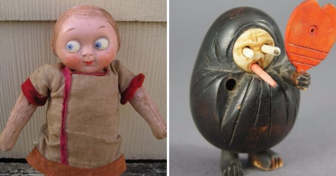 Как выяснилось, в прошлом о таких нюансах заботились крайне мало, в результате чего игрушки получались, мягко говоря, жутковатыми. Они странно выглядели, странно двигались и нередко имели невероятно безумные глаза и улыбки. Глядя на них сегодня, невольно хочется спрятаться под стол или залезть под одеяло.