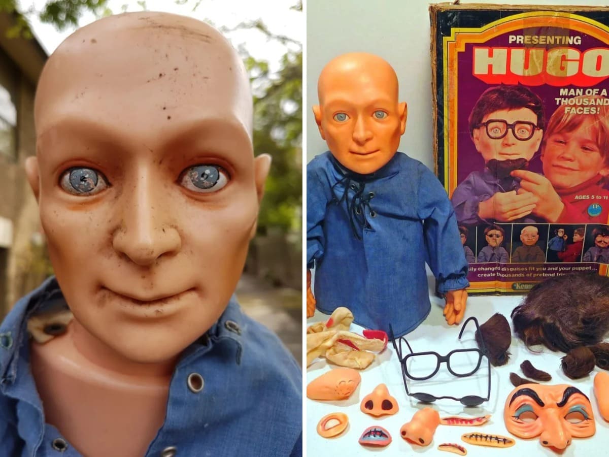 Хьюго — кукла с жутким лицом, похожая на настоящего человека. К ней в комплекте прилагались различные аксессуары: парики, бороды, очки, бородавки и многое другое.